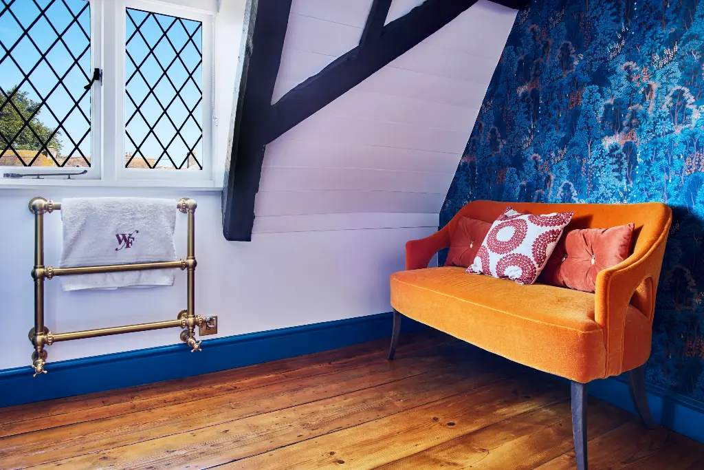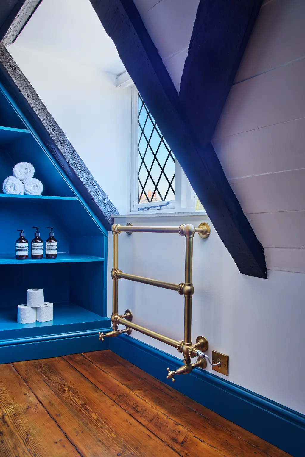 The scheme centres on Graham & Brown’s New Eden Navy wallpaper, whose small-scale pattern suits the loft’s irregular geometry. For the floor, we specified reclaimed timber floorboards to be coherent with the building’s fabric and interiors.