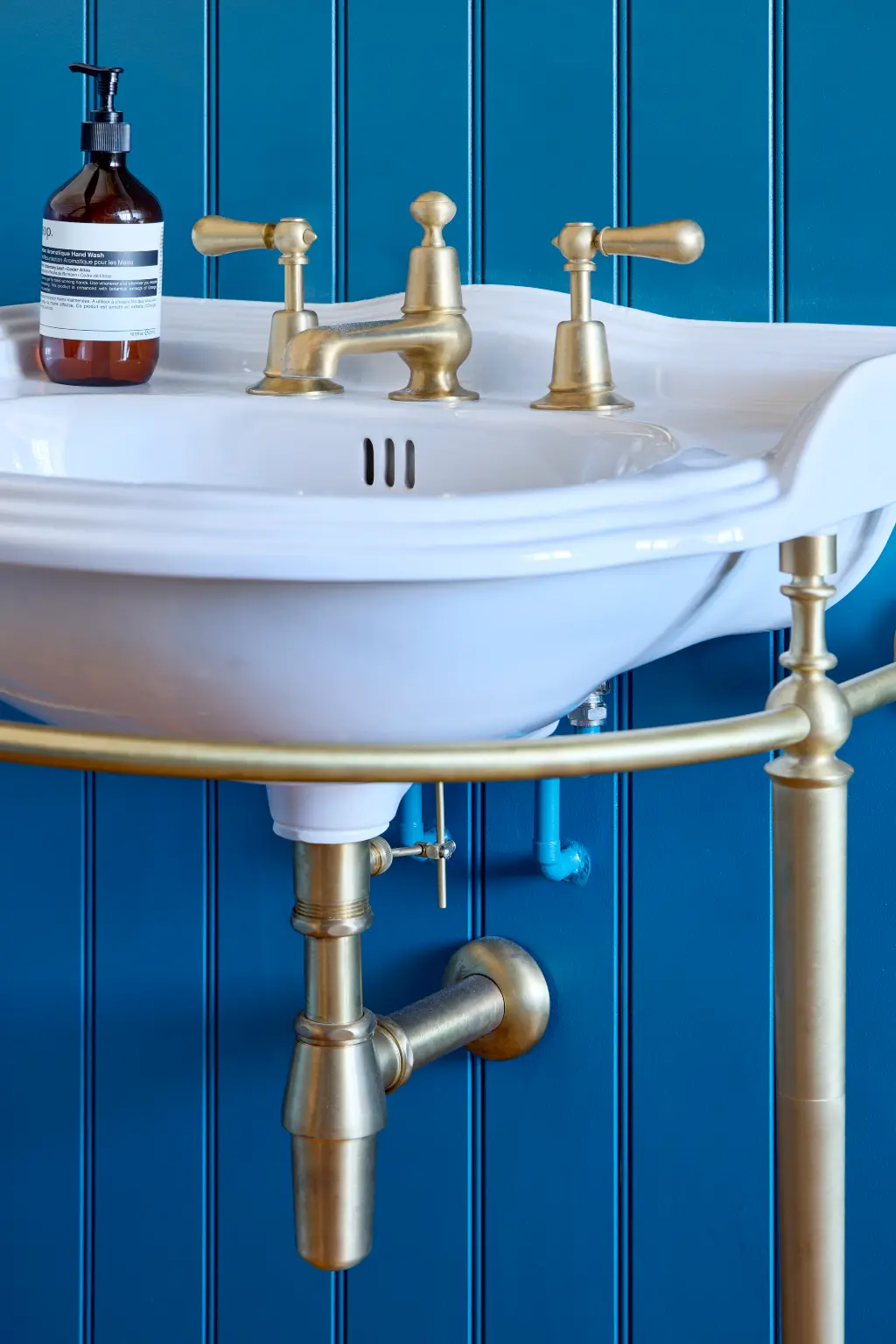 We sourced sanitaryware and brassware with a brushed-brass finish from Catchpole & Rye, a Kent-based manufacturer, to complement the house's age and character. Featuring refined beveled edges and an ornate metal frame, the timeless Victoria Basin brings a subtle yet distinctive twist to a classic design.